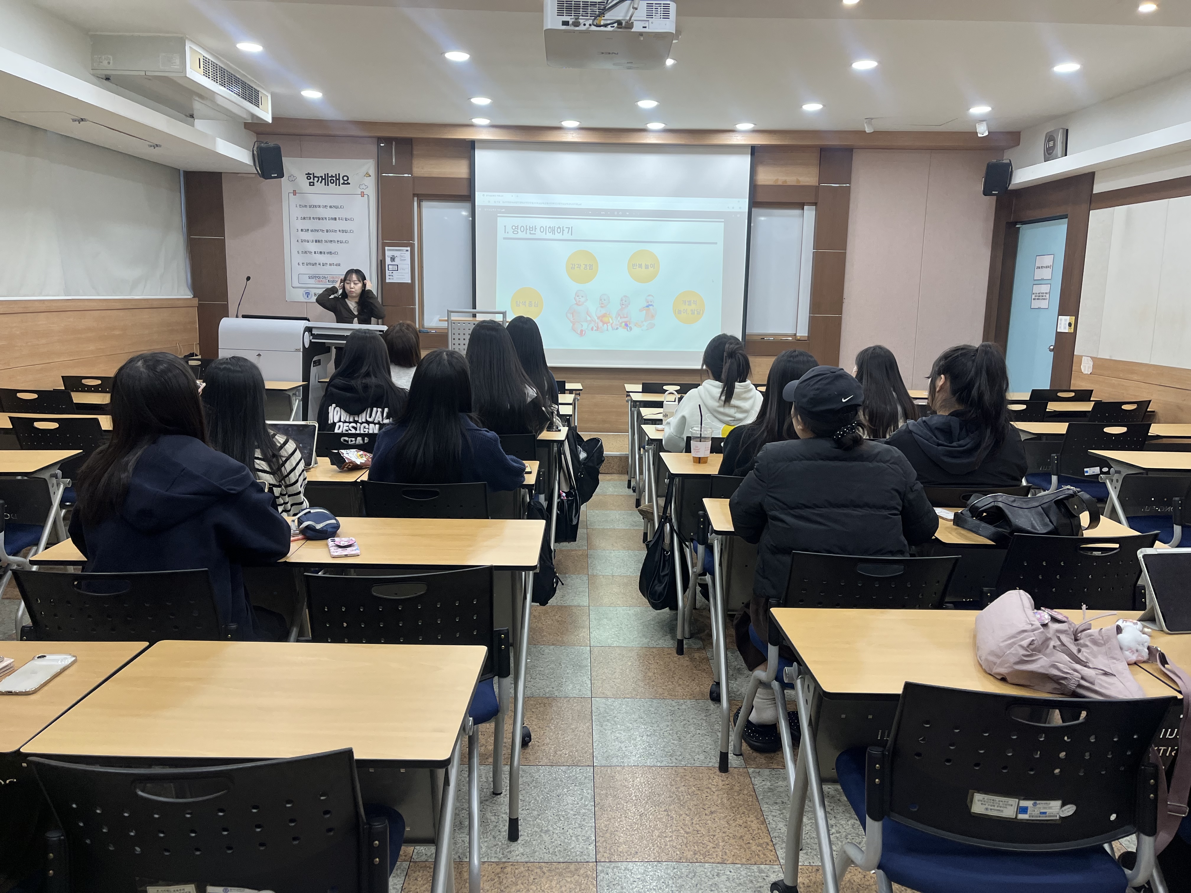 2025학년도 보육실습 준비 특강 1회차가 실습을 앞둔 3학년 학생들을 대상으로 진행되었습니다. 이번 특강은 예비 보육교사로서의 기본 소양을 함양하고, 보육실습 전 사전 준비사항 및 실습 수행 절차를 이해하도록 돕기 위해 마련되었습니다. 특강에서는 보육실습의 전반적인 운영 방식과 기관 선정 및 배정 과정, 실습일지 작성 요령, 실습생의 자세와 유의사항 등을 중심으로 안내하였으며, 실제 보육현장에서 필요한 기본 역량과 전문적 태도에 대해서도 함께 다루었습니다. 학생들은 특강을 통해 실습에 대한 구체적인 이해를 높이고, 보육현장에 나가기 전 필요한 준비사항을 점검할 수 있었습니다. 또한 실습 과정에서 발생할 수 있는 다양한 상황에 대한 대처 방법과 실무 예절 교육을 통해 현장 적응력을 강화하는 시간을 가졌습니다.