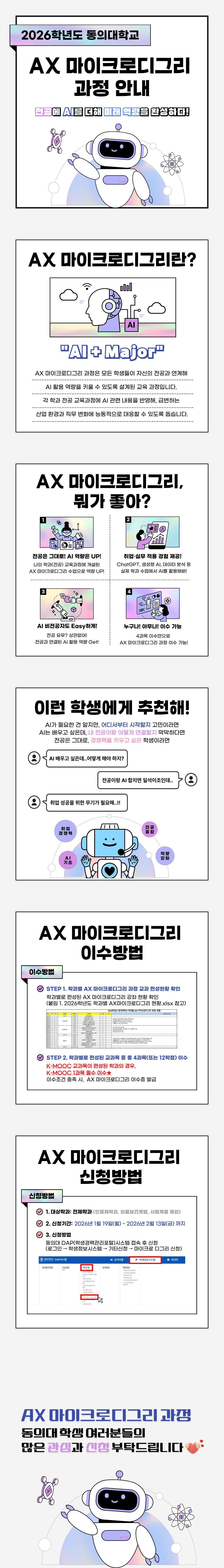 우리 대학은 급변하는 산업 환경과 직무 변화에 능동적으로 대응할 수 있는 미래 인재 양성을 위해, 전공 교육과정에 AI 역량을 결합한 'AX 마이크로디그리'과정을 개발했습니다. 이에 학생분들의 많은 관심과 참여를 부탁드립니다.